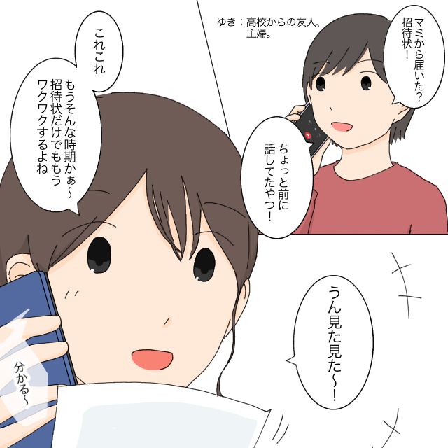 ゆきは高校時代からの友人で、私と同じく主婦をしています。「マミから届いた?招待状、ちょっと前に話してたやつ!」ゆきの言葉に、私は「うん、見た見た~」と答えながら、引き出しに大切にしまっていた結婚式の招待状を取り出します。「これこれ、もうそんな時期かぁ~招待状だけでもうワクワクするよね」子どもたちが生まれてから結婚式に参列する機会がなかった私は、招待状を見ただけで気分が高まってしまいました。