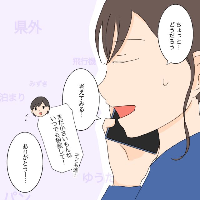 正直、今の状況を考えると外泊なんてとてもできそうにありません。返事に迷った私は「ちょっと・・・どうだろう、考えてみる」と言葉を濁してしまいました。ゆきは私の反応で全てを察したのか「子どもたちまだ小さいもんね、いつでも相談して!」と優しく声をかけます。私はゆきに「ありがとう」とお礼を言い、電話を切りました。