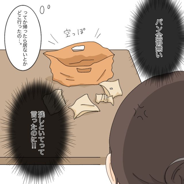 なんと、朝ごはん用に買ってきたパンがひとつも残っていないのです。家を出る前に「好きなものを食べていいよ」とは言いましたが、「全部食べていい」とは言っていません。しかも、わざわざゆうたが「ママはメロンパンが好きなんだよ」と教えてくれたにもかかわらず、そのメロンパンすら残っていないなんて。というか帰ってきたらいないとか・・・その自由さにも呆れます。