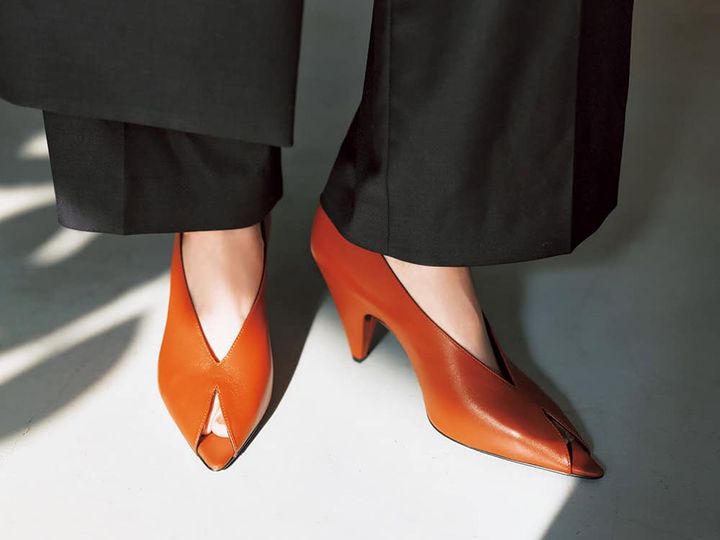春の筆頭トレンドでもあるオープントウは、指先がわずかに見えるバランス感が最旬。エッジの効いた鋭角&女性らしさが際立つデザインで、オフィスで一目置かれる存在に。絶妙に女っぽい〝メイプルブラウン〟も素敵。