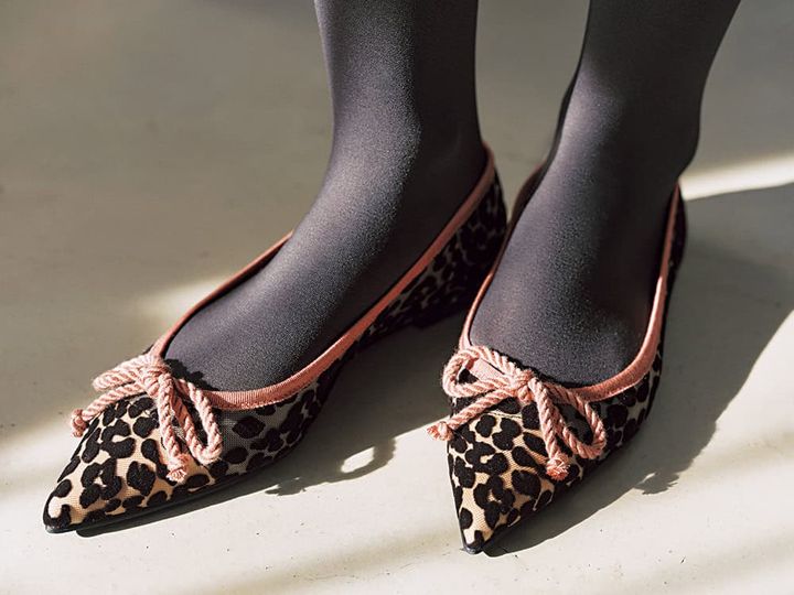 引き続きトレンドのサテン&ハーフパンツの感度高めなALL黒コーデは、キャッチーな柄パンプスでスパイスを。ポインテッドトウ&リボンで甘辛要素をMIXさせるのが大人的。視線の集まる辛口レオパード×最愛ピンクのリボンがグッドバランス。