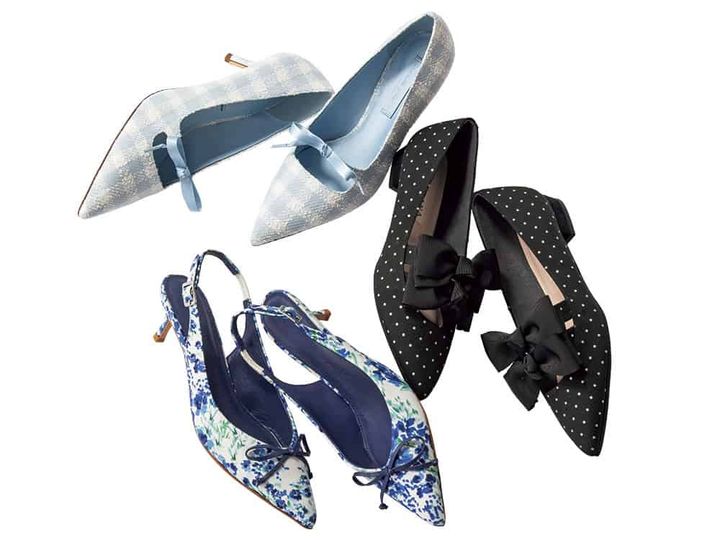 〈上〉チェックの甘要素をハンサムフォルムで引き締め。驚愕プライスにも注目。パンプス¥8,900(CHARLES & KEITH/CHARLES & KEITH JAPAN)〈中〉ラグジュアリー感のあるWリボン。パンプス¥17,600(ダイアナ/ダイアナ 銀座本店)〈下〉アイキャッチなフラワー柄。パンプス¥30,800(ツル バイ マリコ オイカワ)