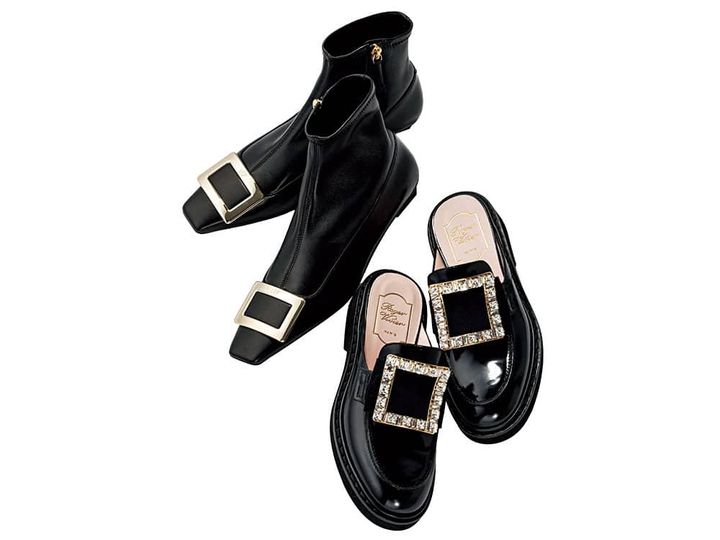 〈上〉エレガントな印象はそのまま、ローヒールの抜け感が洗練。ブーツ¥240,900〈下〉ソックスオシャレも楽しめそう!ミュール¥237,600(ともにロジェ ヴィヴィエ/ロジェ・ヴィヴィエ・ジャパン)