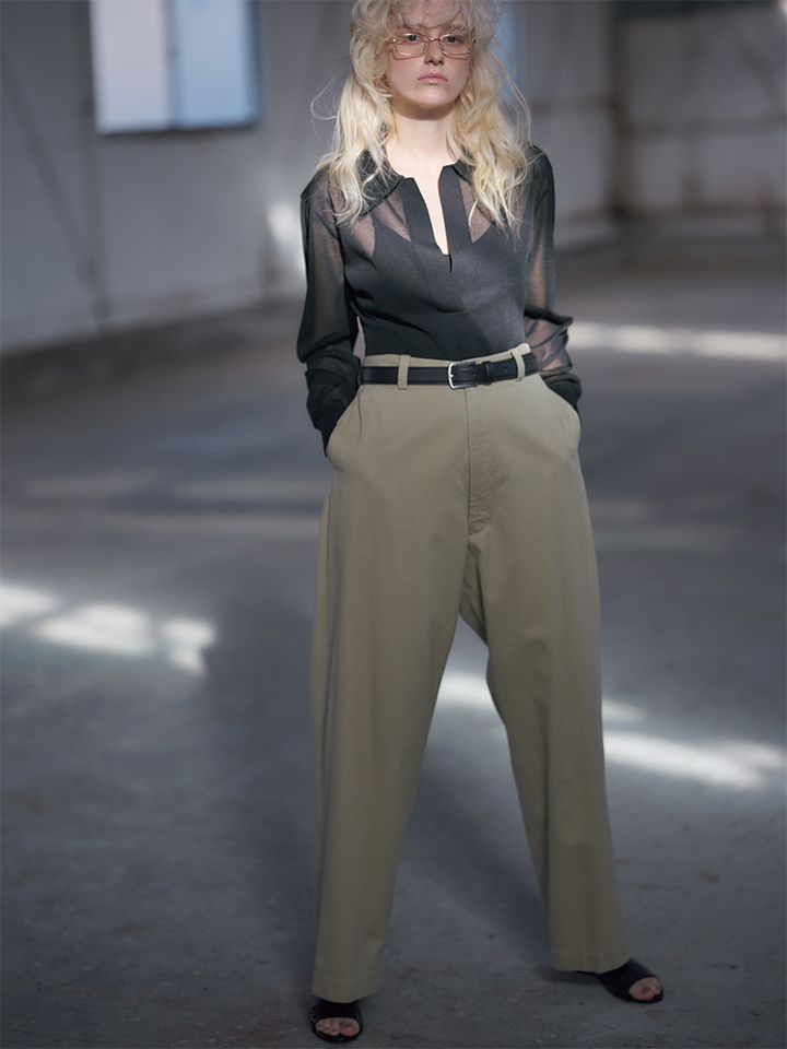 【POINT】センシュアルなトップスにぶつけるのは、メンズライクなワイドチノ。その上下のギャップが、シンプルなワンツーでも凝って見える秘訣。深く開いた胸元も、マニッシュな装いの抜けに一役。