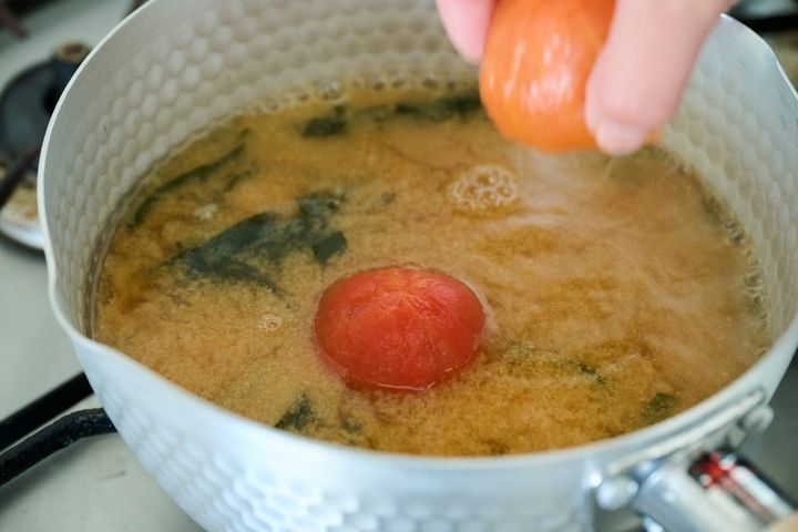 湯むきしたトマトは最後に味噌汁に加えて、ほどよく温まる程度に火を入れます。
