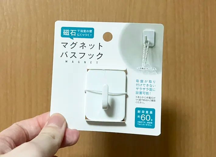 風通しがよく、手に取りやすい場所に置く方法を考えながら100円ショップの『キャンドゥ』に立ち寄った結果、購入したのが『マグネットバスフック』です!