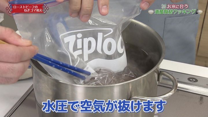 ③キッチンペーパーで油を拭き取り、耐熱温度100℃以上のジッパー付保存袋に入れ、①に口を開けたまま沈め、空気が抜けたらジッパーを閉めて、鍋のフタをして30分おきます。