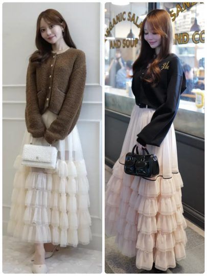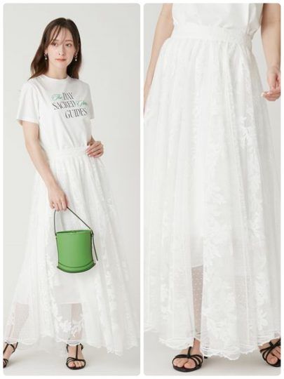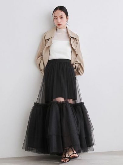 繊細なチュールを贅沢に重ねたティアードデザインで、歩くたびにふわりと揺れる存在感抜群の一枚。上段には上品な透け感を残しつつ、下に向かって立体的なチュールをたっぷり配置し、“大人ロマンティック”な印象に。