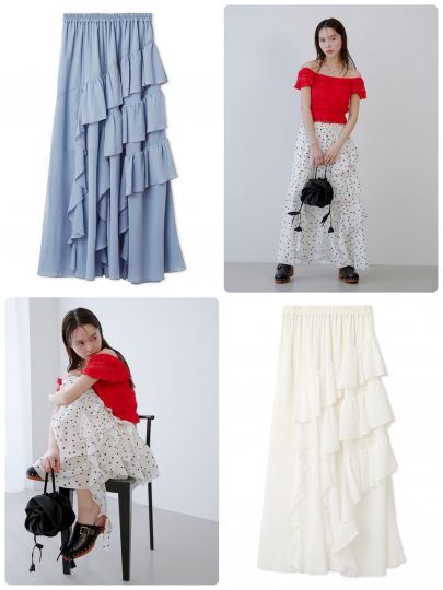 上から下へと流れ落ちるように計算されたラッフルフリルが、歩くたびに軽やかに揺れるティアードスカート。ドット柄はとくにトレンド感抜群!