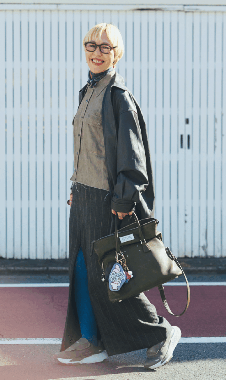 「私は、持ち物が多いので大きめトートをヘビーユース。デザイン重視で軽さはあまり気にしていません」。靴とバッグはデザイン性の高いものを。そうすれば、仮に服がプチプラブランドでも素敵に見えるそう。さらに、その人の『個性』を印象付けるのがめがね。