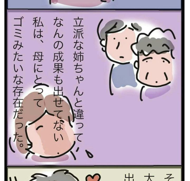 小さいころから、優秀な姉と比べられていた おかん子さん。「しょーもない」「期待はずれ」と言われながら育つのは、本当にきついですね…。