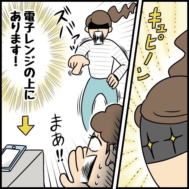 散らかった部屋の中を義母はスマホを探してウロウロ・・。そのとき、キュピーンと閃いた私。そういえば、さっき義母はスマホを持ってキッチンに行ったような・・。キッチンを見渡してみると、ありました!「電子レンジの上にあります!」私が先に見つけたことに義母は「まぁ!!」と、とても驚いていました。