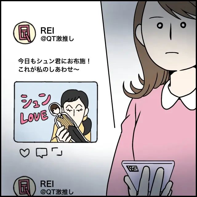 私は静かにスマホを取り出し、玲美さんのSNSアカウントをじっと見つめます。画面には「今日もシュン君にお布施!これが私のしあわせ」というつぶやきが。私は玲美さんに義実家からいなくなってほしかった、一方の玲美さんは誰にも干渉されずシュン君を気の済むまで推したかった。私たちは利害が一致した、ただそれだけ。