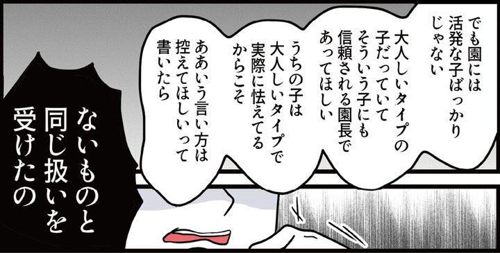 私はホナミ。夫のマモルと娘のエリカ(年長)、息子のユウゴ(2歳)と暮らしています。半年前に引っ越してきて、エリカは認可外保育施設に入りました。しかし園の対応にはいろいろと気になることが……。私は配られたアンケートに要望を記入して提出しました。すると園長先生は謝罪と見せかけて私のことを牽制し、あげく自分たちに都合の悪い意見は揉み消してきたのです。事態を楽観視していたマモルも、ようやく私の不安を理解してくれました。