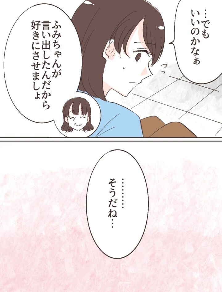 ふみのは「任せて」と言ってくれましたが、これまでも私の代わりに智美さんにはっきり言ってくれたり、関わらないようにしてくれたりと、頼ってばかりです。「いいのかなぁ」とためらっていると、母が「ふみちゃんが言い出したんだから好きにさせましょ」と背中を押してくれました。