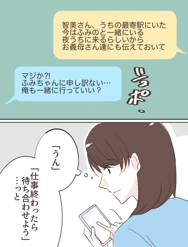 母の言う通り、智美さんのことはふみのに任せることにしました。会社に出社したあと、「智美さん、うちの最寄り駅にいた、今はふみのと一緒にいて夜にうちに来るらしいからお義母さんたちにも伝えておいて」修吾にそうメッセージを送ると「ふみちゃんに申し訳ない・・・俺も一緒に行っていい?」と返事が返ってきました。私は仕事終わりに修吾と待ち合わせをしてから、家に帰ることにしました。