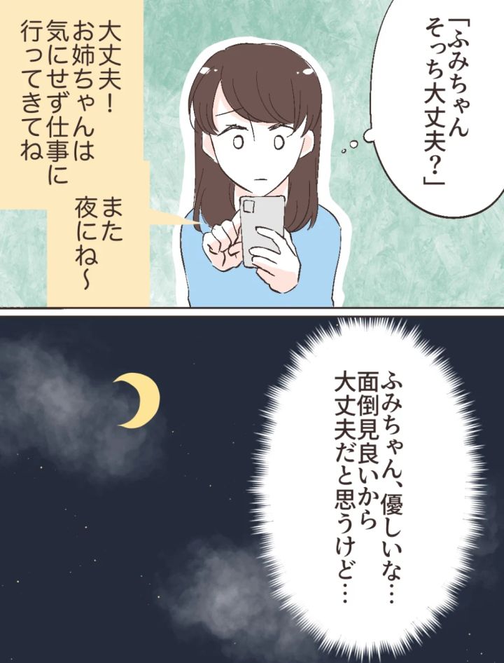 続けて、私はふみのに「そっちは大丈夫?」とメッセージを送りました。すると「お姉ちゃんは気にせず仕事に行ってきてね」とすぐに返信が。ふみのが何を考えているのかは分かりませんが、面倒見が良くて優しい妹です。きっと大丈夫だろうと、私は仕事に集中することにしました。