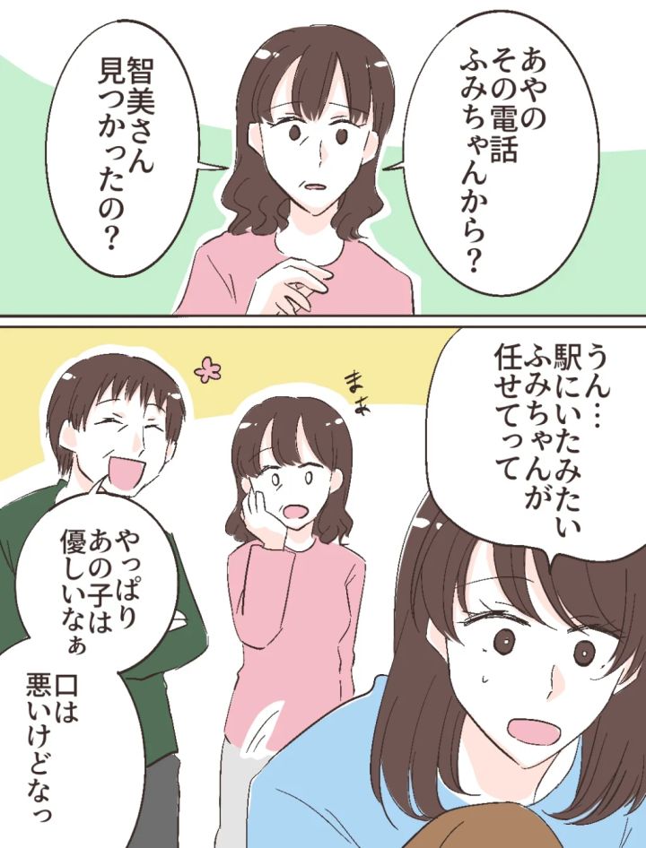 私の慌てた様子を見て、智美さんが見つかったのだろうと思ったのか、母が「あやの、その電話ふみちゃんから?智美さん見つかったの?」と声をかけてきました。私は「駅にいたみたい、ふみちゃんが任せてって」と、ふみのから聞いたままを伝えます。