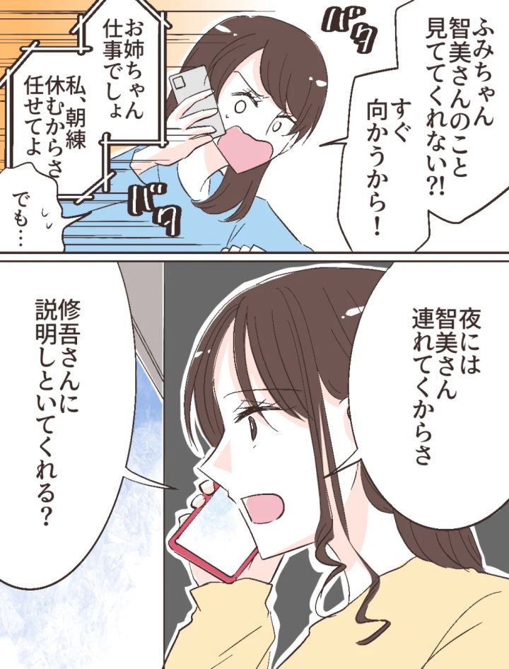ふみのから連絡を受けた私は、「ふみちゃん智美さんのこと見ててくれない!?すぐ向かうから」と伝え、慌てて迎えに行く準備をします。するとふみのが「お姉ちゃん仕事でしょ、私朝練休むから任せてよ」と言ってくれました。そう言ってくれるのはありがたいですが、これ以上頼るわけにはいかないとためらっていると、「夜には智美さん連れてくからさ、修吾さんに説明しといてくれる?」と言って、そのまま電話を切りました。