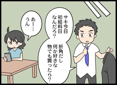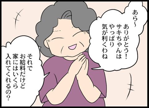 初給料日を迎えたサキがケーキを買って帰宅すると、すぐに義母が笑顔で「お給料いくら?」と聞いてきたのでした。