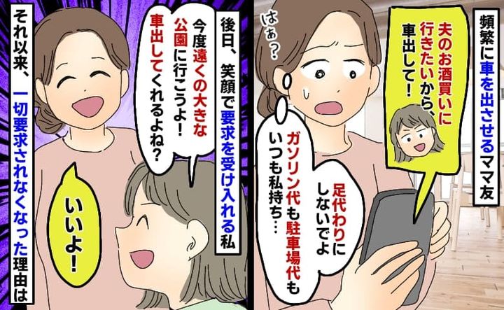 「夫のお酒買いたいの!車いい?」私を足代わりに使うママ友「OK!じゃあさ?」私の反撃にフリーズ