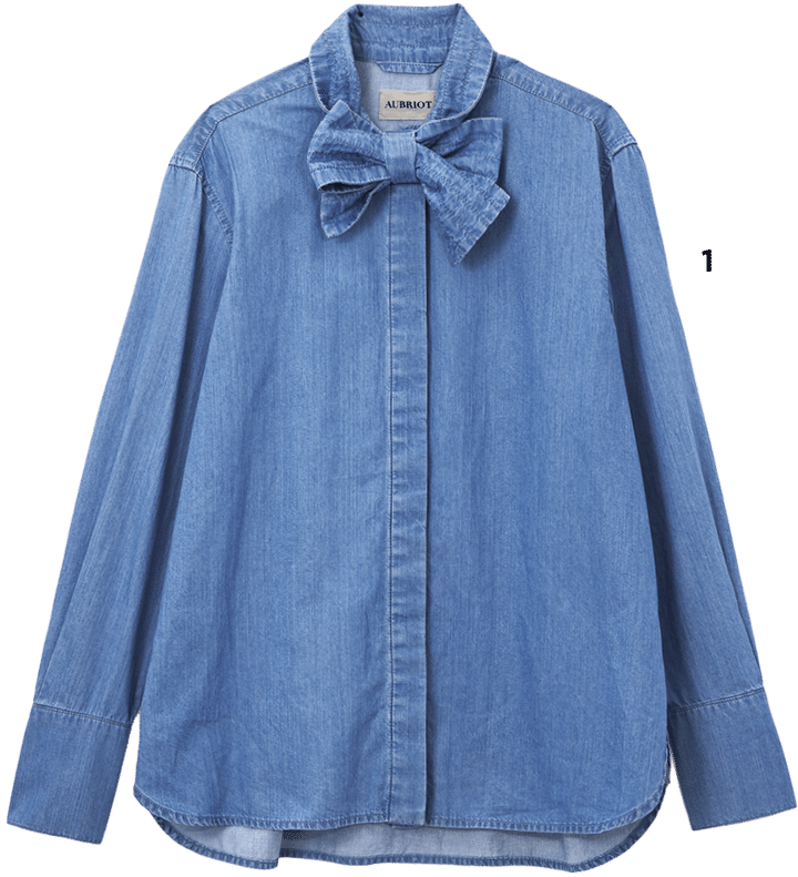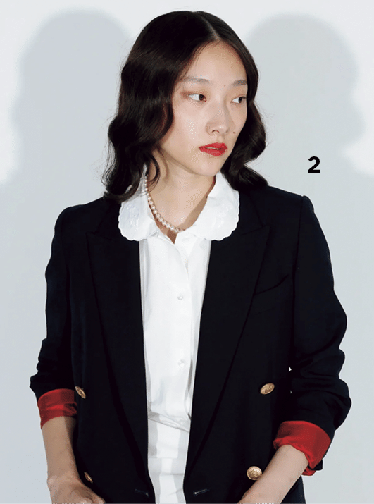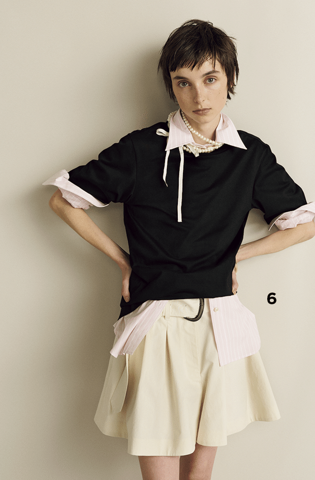 編集T(以下T) いいですよね。Wさんがミディ丈のタイトスカートとか新鮮! すごく似合いそう。私は、パート2でも特集を担当しましたが、シャツが気になります。ボウタイシャツ❶は1枚でも様になるし、リボン結びにしてちょっとレディな感じで着たい。丸襟も気になってて、ジャケットとパールネックレスを組み合わせたマディソンブルーのルック❷が可愛いなと。