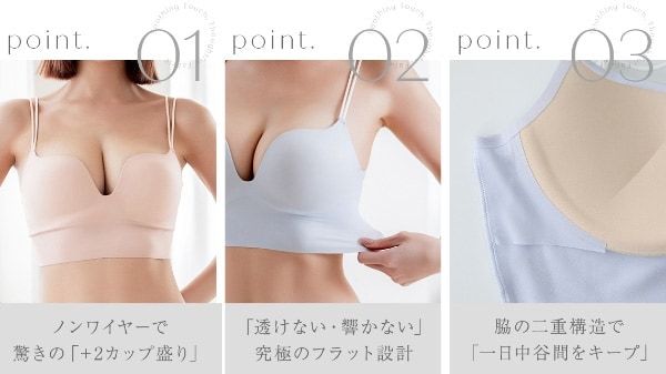 内蔵された立体パッドがバストを下から押し上げることで、ノンワイヤーでありながら+2カップ相当のボリューム感を演出します。
