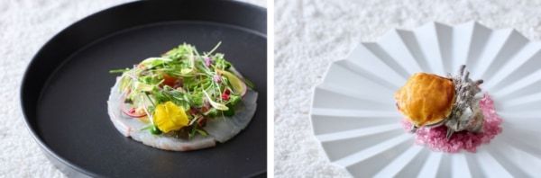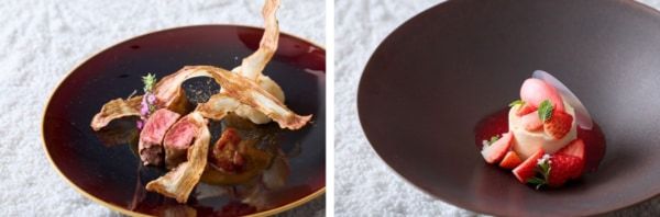 <和とフレンチが融合する“フレンチジャポネ”「春の祝祭〜花うらら〜」> コーステーマは「春の庭園」。桜鯛や春苺といった旬の食材を主役に、地元愛知が誇るブランド米「あいちのかおり」や西京味噌・蕗の薹など、和の調味料やエッセンスを独創的なフレンチの技法で昇華させました。