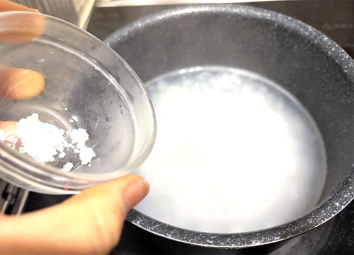 2. 1の大根と米を鍋に入れて、水を加えて火にかける。沸騰したらひと混ぜし、米がおどるくらいの中火~弱火にし、鍋のフタを少しずらして吹きこぼれに注意しながら15分~20分炊く。
