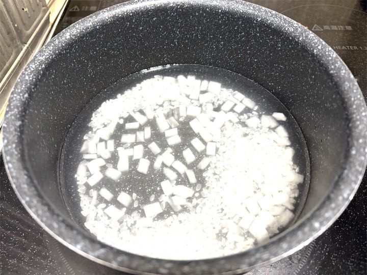 1. 大根は皮を剥いて、5mmくらいのサイコロ状に切る。米は研いでおく。