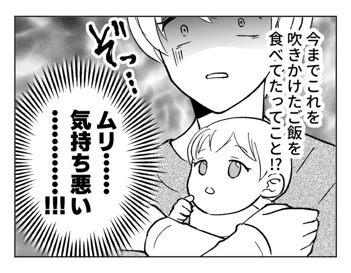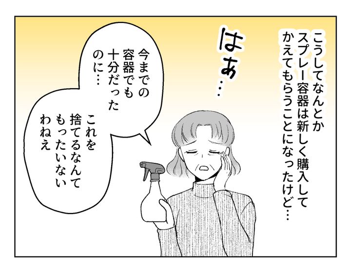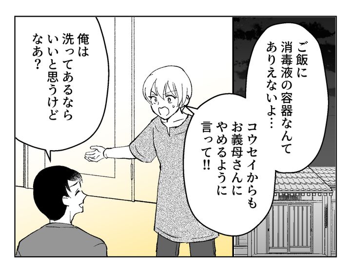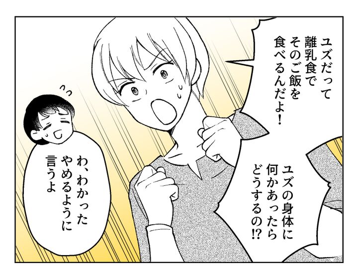 この親にしてこの子あり。コウセイさんもお義母さんの行動をあまり気にしていない様子ですね……。が、「ユズの身体に害があっては困るでしょ?」と言われてようやくわかってくれたようです。お義母さんはこの期に及んでまだ「もったいない」とグチグチ言っているようですが、ひとまず容器を変えてもらうことができてよかったですね、フミカさん!