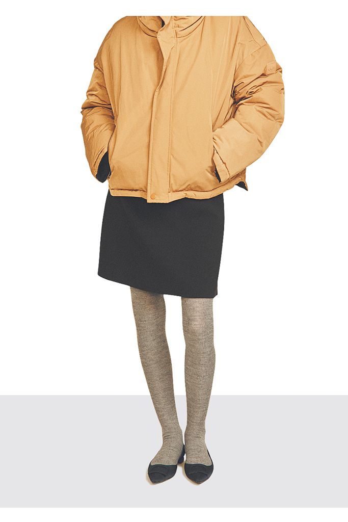 グレーリブ裏起毛タイツ/靴下屋(タビオ) ベージュダウンコート/OOF WEAR(ティースクエア プレスルーム) ミニスカート/ルル・ウィルビー(アルアバイル) シューズ/TSURU By MARIKO OIKAWA