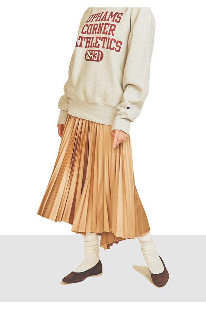 シアーソックス/17℃(Blondoll 新丸の内ビル店) ケーブルソックス/UNIQLO スエットトップス/チャンピオン(ヘインズブランズ ジャパン カスタマーセンター) プリーツスカート/プラステ ブラウンスエードシューズ/ファビオ ルスコーニ(伊勢丹新宿店 本館2階 婦人靴)