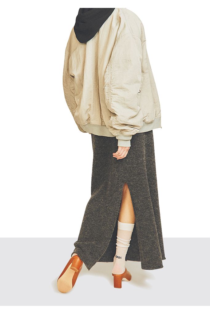 ロゴソックス/SORIN(SORIN池袋パルコ店) ブルゾン/uncrave スエットトップス/スローン(ザ ショップ スローン 新静岡セノバ店) グレーニットスカート/CLOSED(トヨダトレーディング プレスルーム) ブラウンミュール/Mollini(ジャック・オブ・オール・トレーズ プレスルーム)