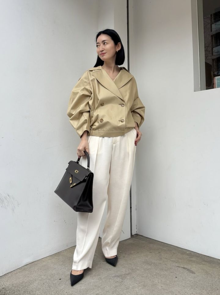 「今季注目のショートトレンチをメインに。エポーレットやカフストラップといったトレンチコートのディテールを踏襲しているので、デニムパンツにカットソーといったシンプル合わせでも、大人にちょうどいいカジュアルスタイルへ仕上がります。着丈が短いので、低身長の私でもバランスがとりやすく新鮮な雰囲気になります」