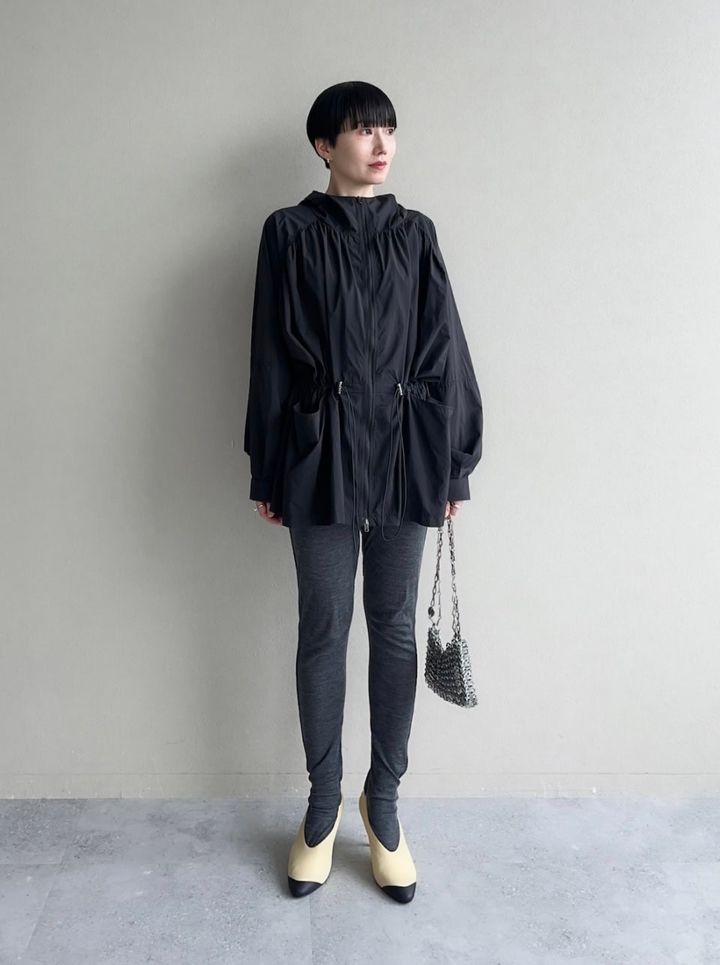 「スポーティな印象になりがちなナイロンブルゾンをモード感のある着こなしに仕上げました。ドロスト付きのアウターでウエストマークをし、ボトムスにはコンパクトなタイツを合わせ今年らしいシルエットに。シンプルにモノトーンでまとめた上下に、シルバーのバッグやライトベージュのパンプスを合わせて、春の軽やかさを加えました」