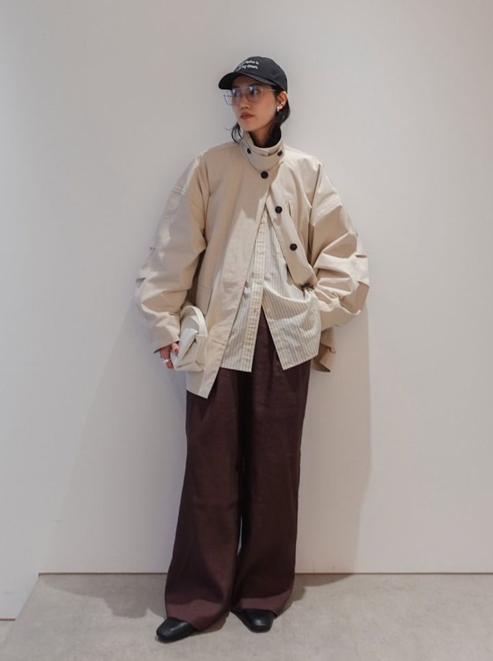 「春らしい明るいカラーのハーフコートが主役。トーンを揃えたストライプシャツとリネン素材のブラウンボトムで柔らかな雰囲気に仕上げました。ブラックの小物で全体を引き締め、カジュアルスタイルをシックにまとめています」