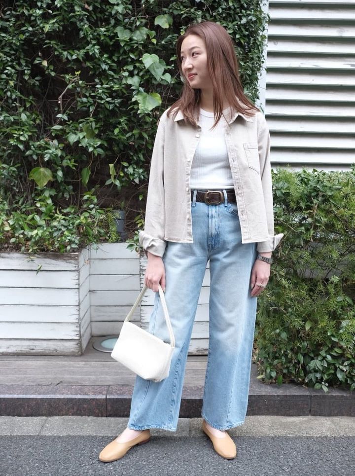 「コンパクトなブラウンベージュのデニムトップスは、しっかりめの生地感なので春のアウターとしても活躍。ボトムにはハイウエストのライトブルーデニムパンツを合わせスタイリングしました。シルエットのコントラストでバランスを楽しみつつ、小物もトーンをそろえて、春らしい柔らかなムードにまとめています」