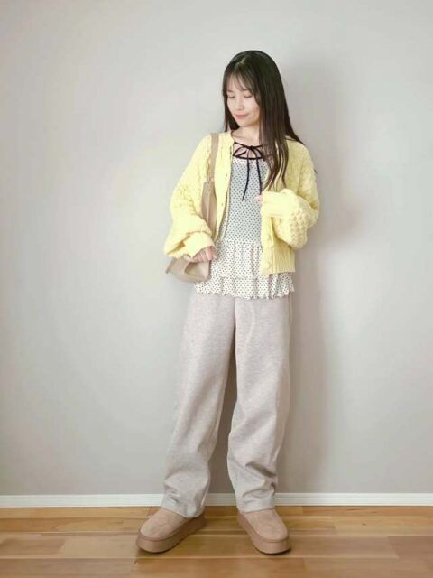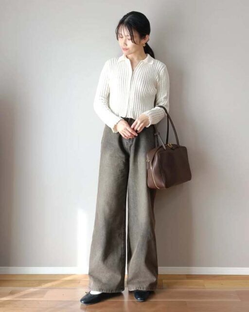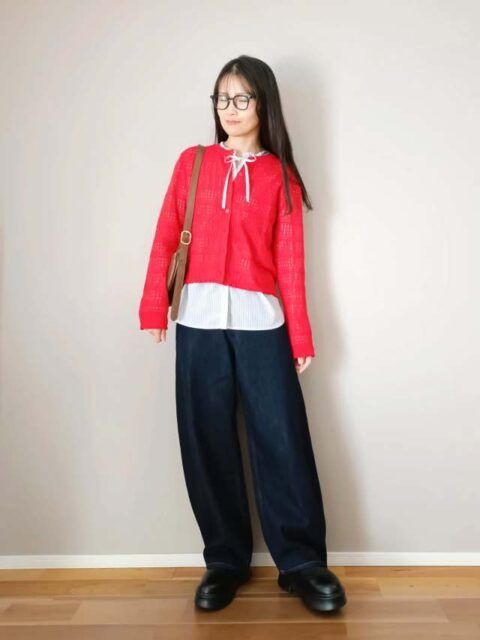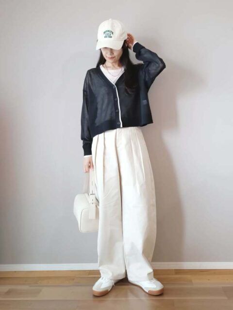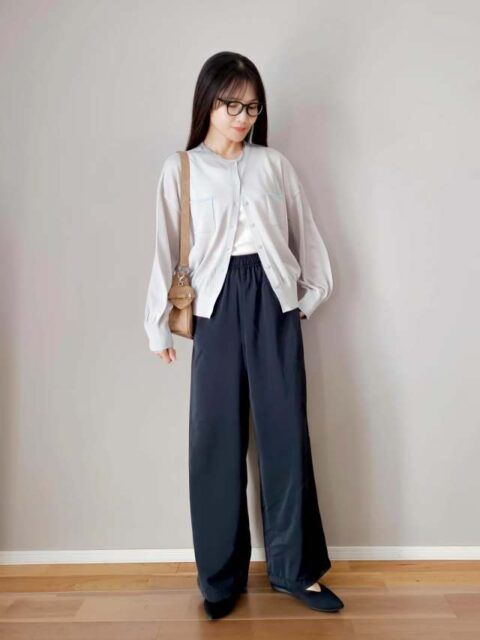 カジュアルに着こなしたいときは下にシャツ・ブラウスを合わせ、裾出しつつワイドパンツをプラス。お目立ちなカーディガンをグッとタウンユースしやすくなりますよ。