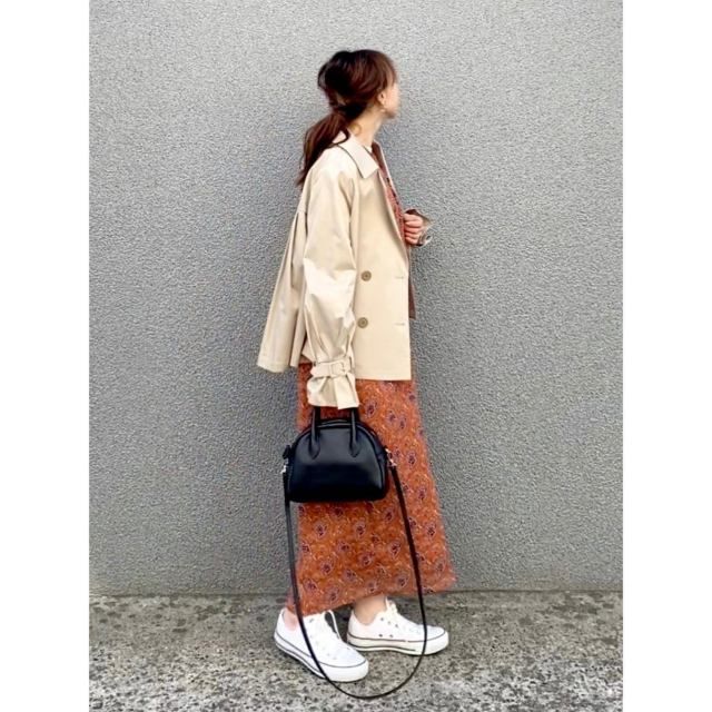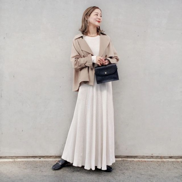 ショート丈トレンチコート×ロングワンピースのコーデ