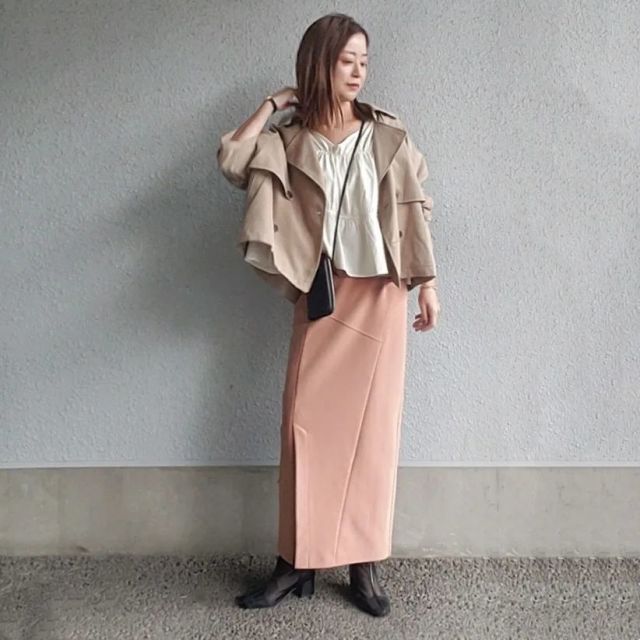 ショート丈トレンチコート×春色スカートのコーデ