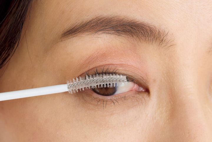 黒フレーム×黒マスカラでは印象が強くなりすぎてしまうので、ビューラーでまつ毛をカールしたら、透明マスカラをつけてキープを。