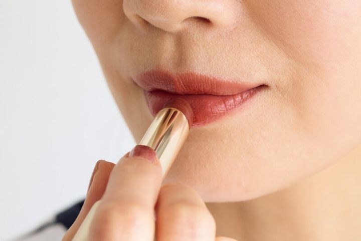 スティックでサッと塗った後、上下の唇を合わせてラフになじませて。