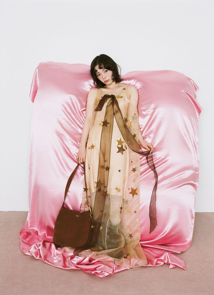 朝にかけてキラキラと透けていく星空のような、オーガンジーのシフトドレス。胸元からたっぷりと垂らしたリボンが、大人ロマンティックに拍車をかけるあざとさ。スエードバッグとブーツの無骨さで今っぽく。