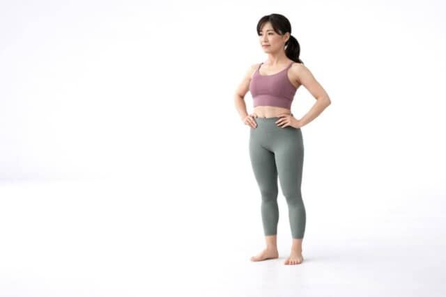 足をこぶしひとつ分ほど開いて立ち、背筋をすっと伸ばします。首・肩・骨盤・くるぶしが一直線になるイメージで体の軸を安定させましょう。手は腰に添え、重心は中央に。