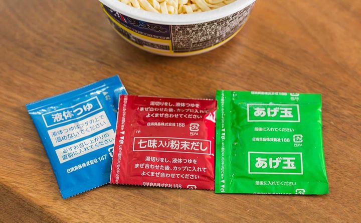 カップの中には麺などと一緒に、「液体つゆ」と「七味入り粉末だし」「あげ玉」の袋が入っています。