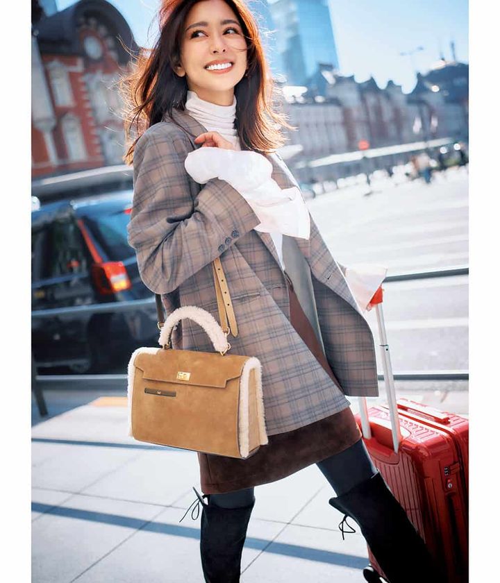 ジャケット¥29,700(メゾンスペシャル/メゾンスペシャル 青山店)ミニスカート¥18,700(アルページュストーリーオリジナル)カットソー¥15,400(LE PHIL)キャリーケース¥143,000(リモワ/リモワ クライアントサービス)バッグ¥363,000(アニヤ・ハインドマーチ/アニヤ・ハインドマーチ ジャパン)ブーツ¥15,900(チャールズ&キース/チャールズ&キース ジャパン)タイツ¥1,210(靴下屋/タビオ)左手人差し指リング[2本セット]¥39,160(ソコ/ZUTTOHOLIC)