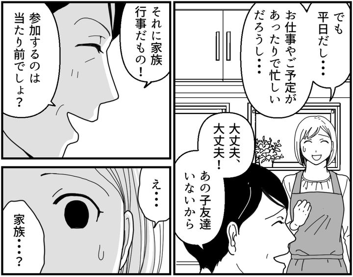 保育園の発表会があるのは週なかばの水曜です。社会人のセリナちゃんは普通にお仕事があるはずです。けれど義母に「セリナちゃんは……」と聞いてみたら、「きっと来ると思うわよ?」と即答されました。それが当然といった口調です。