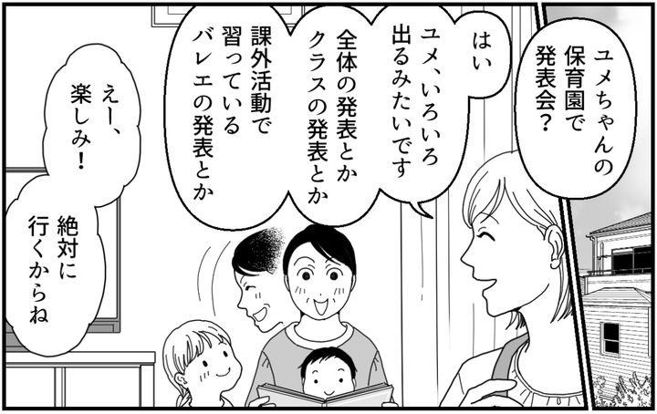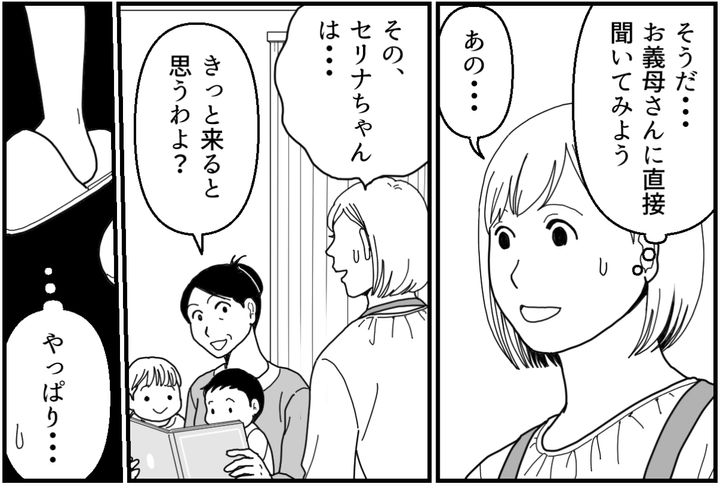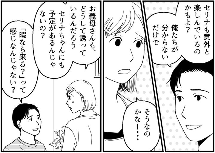 セリナちゃんも立派な社会人だし、兄の家族と頻繁に会わなきゃいけないわけじゃありません。義母もいったいどういうつもりで誘っているんだろう……。ふとそんな考えが浮かびます。そんななか、義母と保育園の発表会の話になりました。