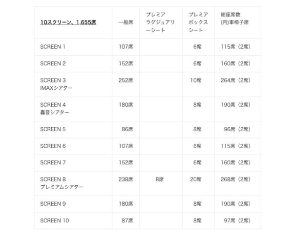 左右の壁いっぱいに拡大された巨大スクリーン(プレミアムラージフォーマット)、シアター形状に最適化した形でスピーカーをカスタマイズした良質な音響(プレミアムサウンド)、プライベート空間が確保された広々とした座席(プレミアムシート)を兼ね備えたTOHOシネマズ独自規格の高品質シアターです。